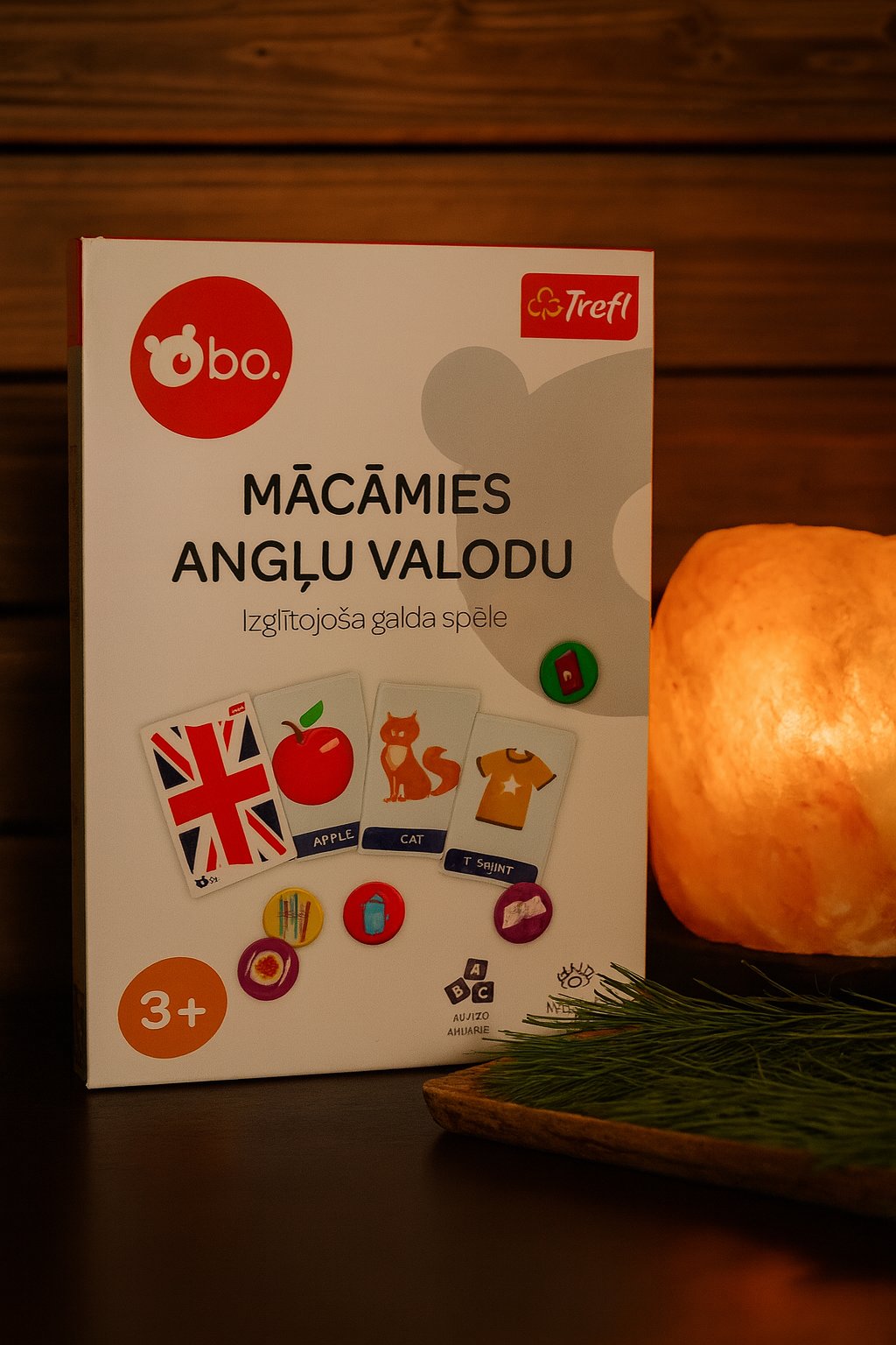 Spēlējiet ne tikai pie galda – ļaujiet bērnam atrast apkārtējā vidē atbilstošus priekšmetus (apple – ābols, dog – suns). Tā mācīšanās kļūst dzīva un dabiska, un bērns redz, ka valoda darbojas ikdienā.