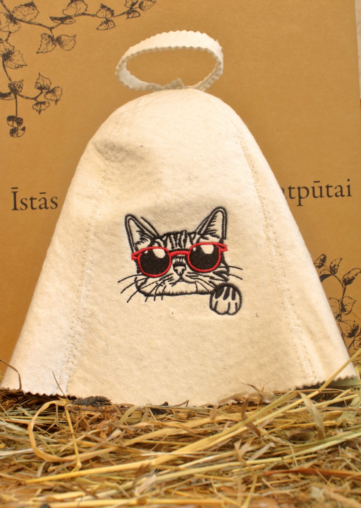 Pirts cepure “Kaķis ar sarkanajām brillēm” – stils, humors un labs garastāvoklis pirtī 😎🐾