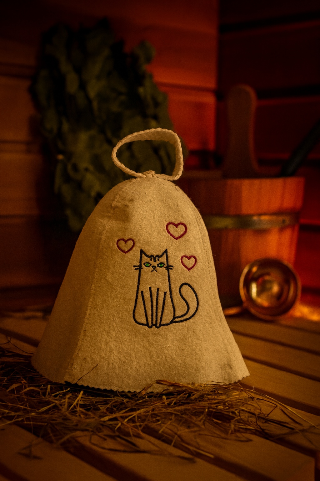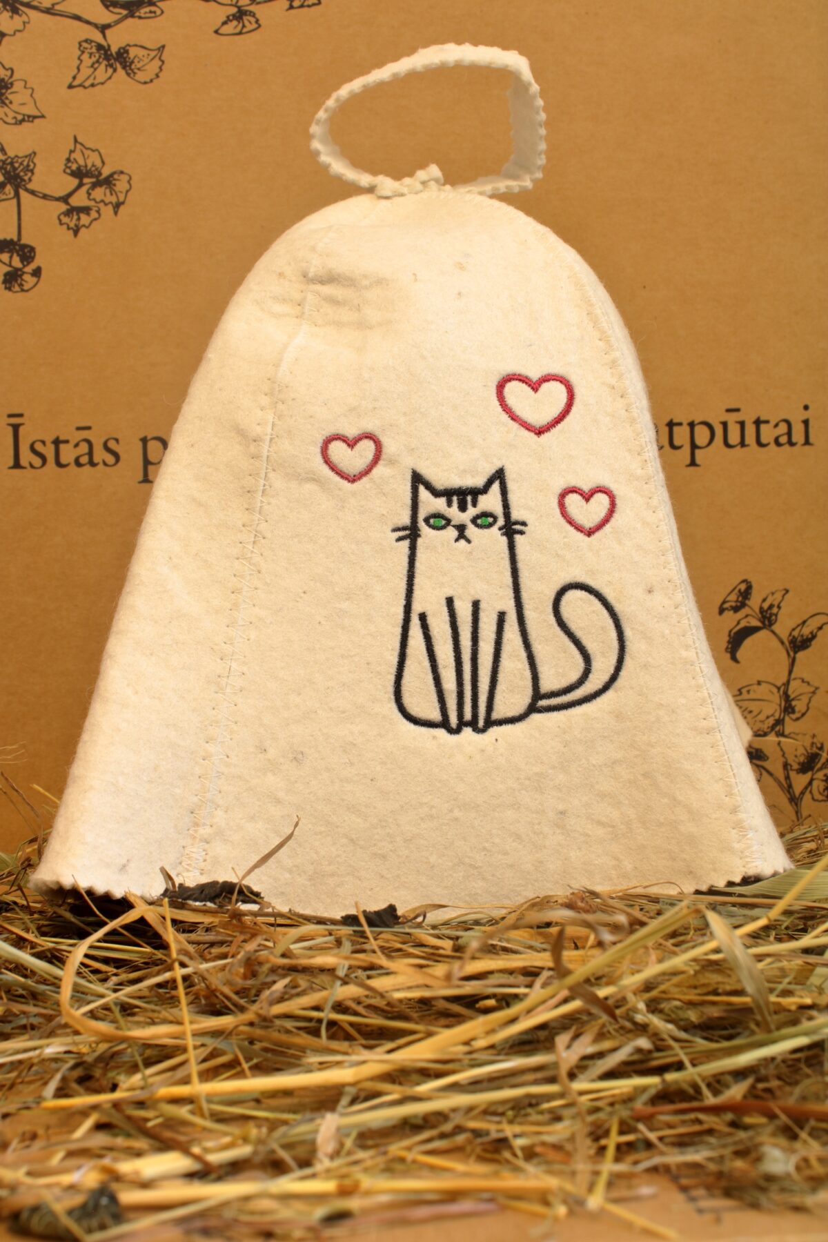 SākumsPirts drēbesCepures Pirts cepure “Mīlošā kaķenīte” – sirsnībai un labsajūtai pirtī 😺💛