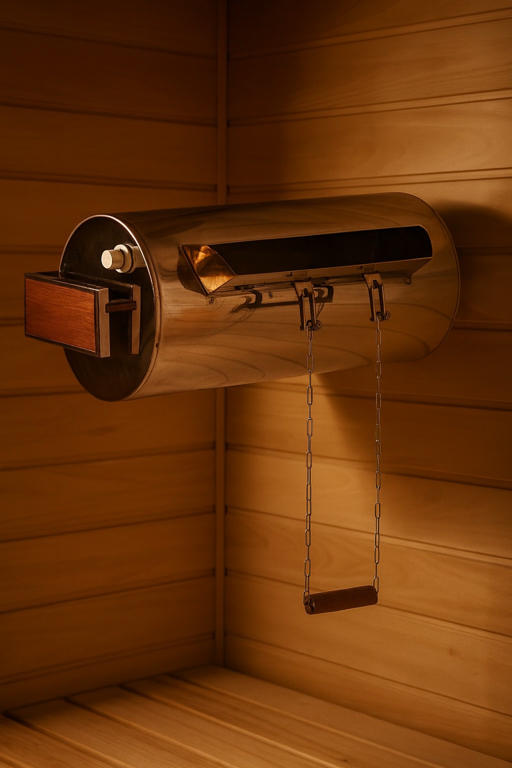 Cilindriskā forma ar precīzām metāla līnijām piešķir minimālisma eleganci. Tas izskatās nevainojami gan klasiskā koka pirtī, gan modernā sauna telpā.