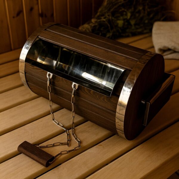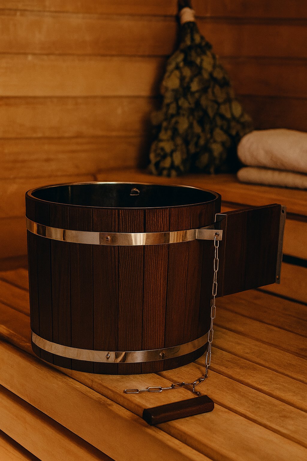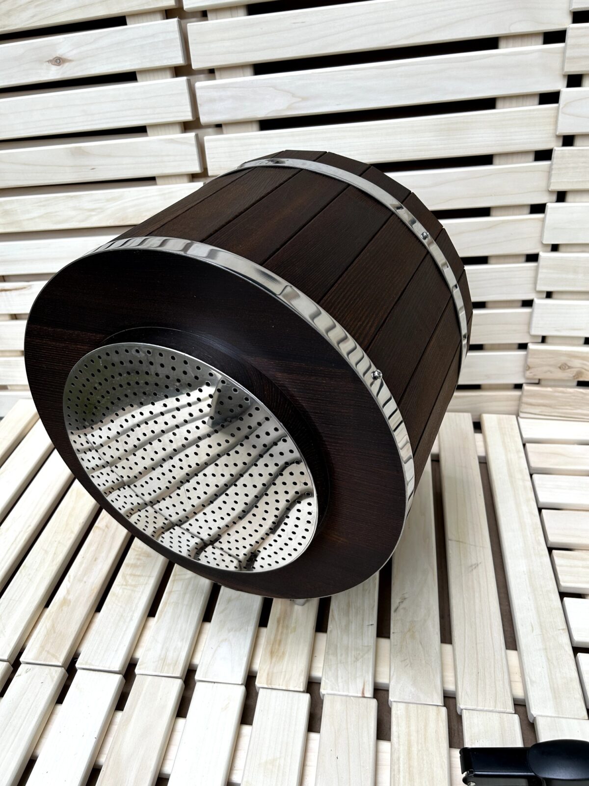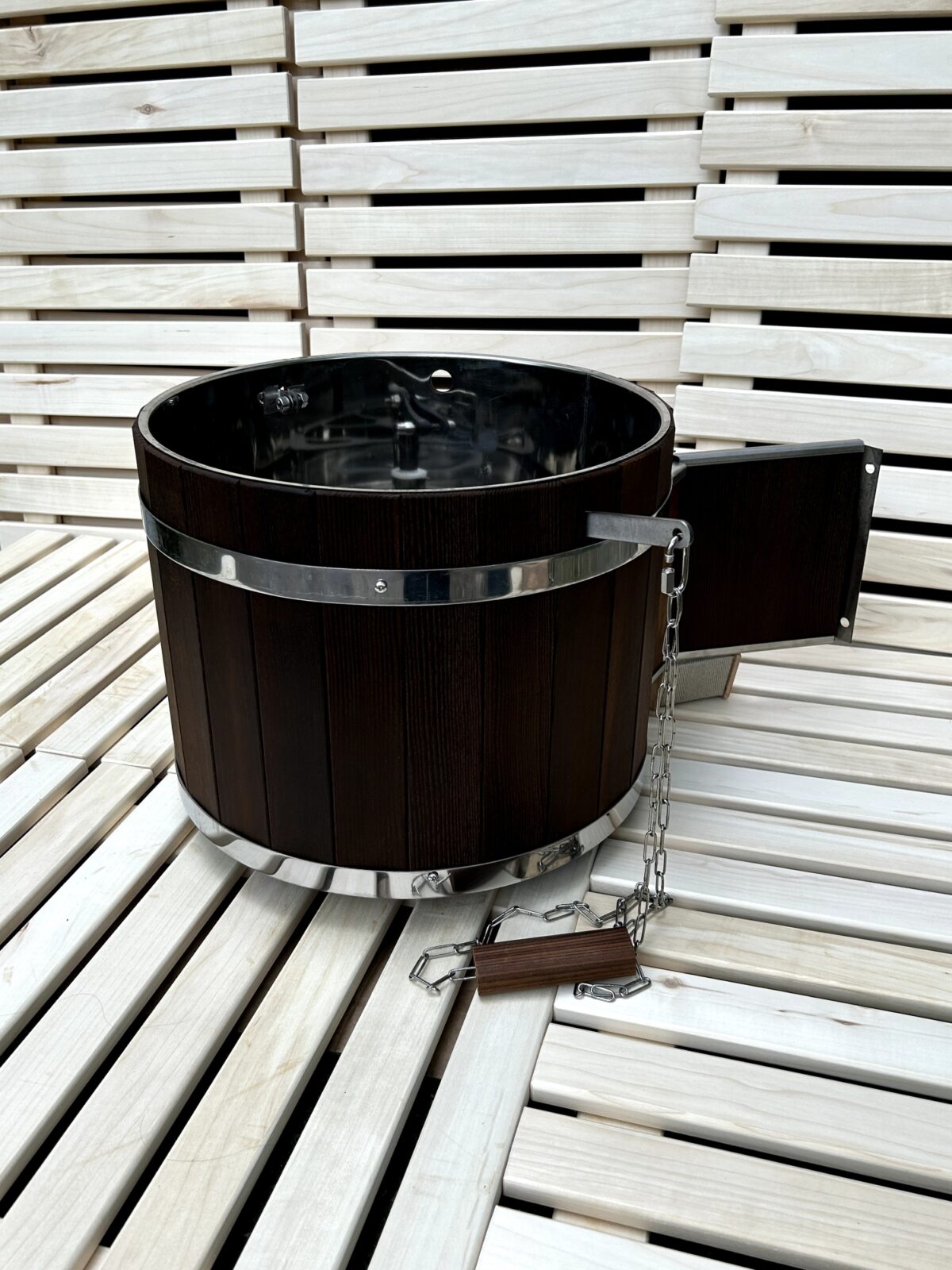 Tumšais koks ar nerūsējošā tērauda apļstīpām un vāku rada stingru, bet elegantu noskaņu. Bļoda saskan ar pirts interjeru un izceļ dabisko materiālu siltumu. Tā ir gan praktisks, gan vizuāli skaists priekšmets, kas piešķir pirtij sakoptības sajūtu.