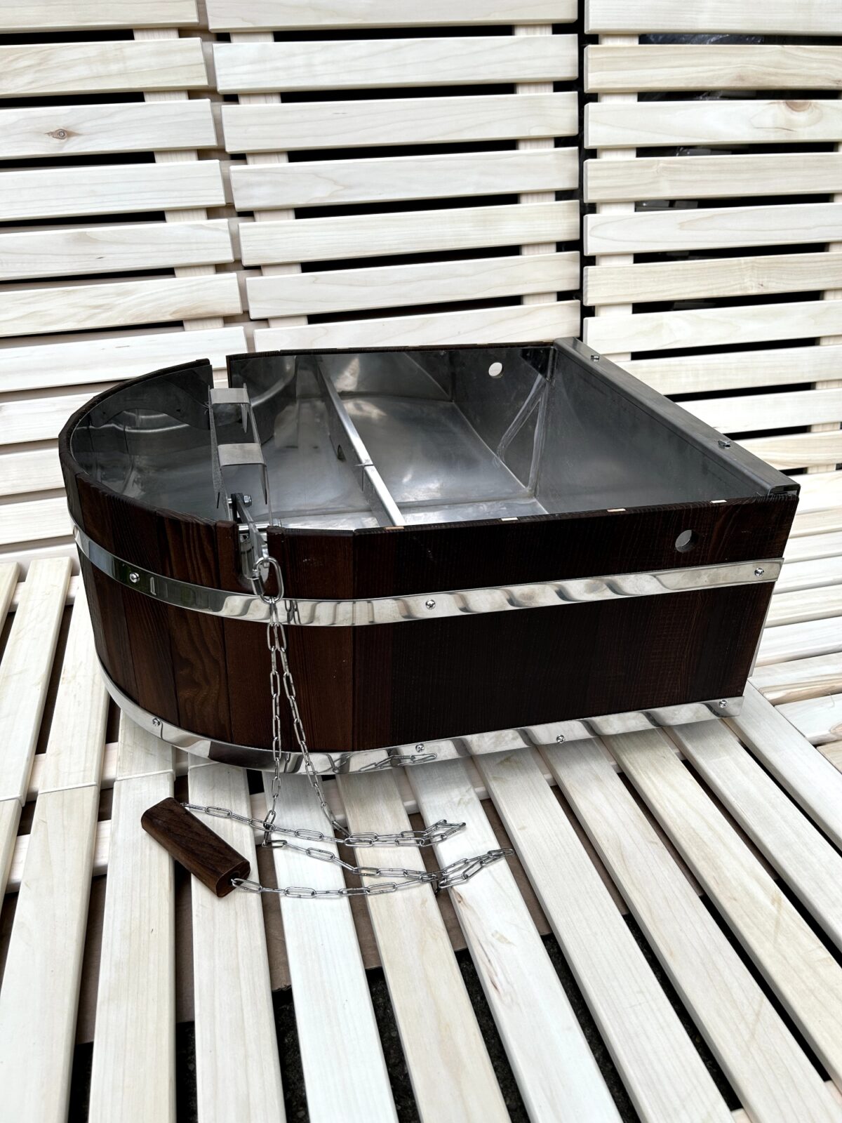 Šis modelis apvieno izturību, dizaina tīrību un pirts tradīcijas. Tas nav tikai atvēsināšanās rīks – tā ir sajūtu pieredze, kur ūdens, koks un metāls savienojas vienā, radot pilnīgu harmoniju.