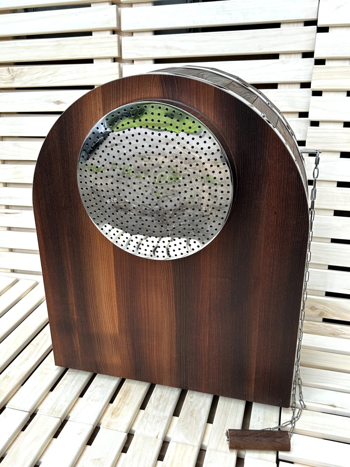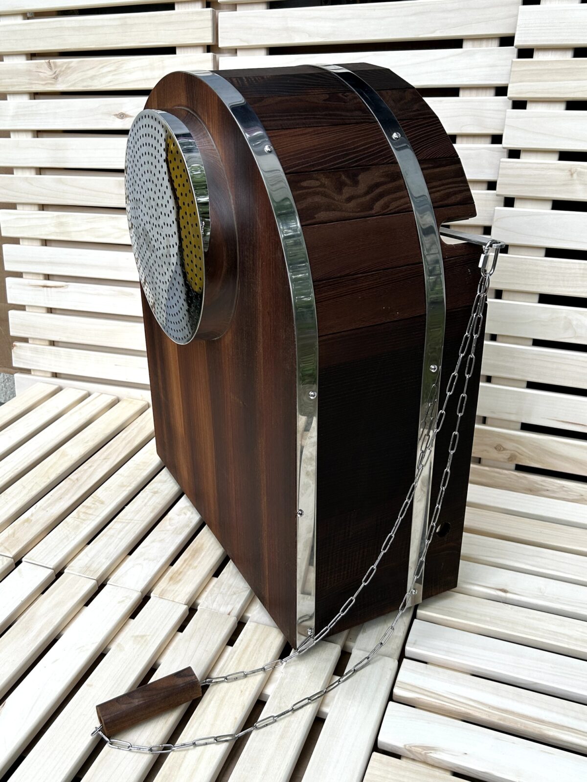 LIETUS LUX ir vizuāli harmonisks – tumša koka toņi, spīdīgas metāla apļstīpas un precīzi izstrādāta forma rada greznu, bet dabisku izskatu. Šis ūdenskrītums ir vairāk nekā tehnisks aprīkojums – tas ir dizaina akcents, kas izdaiļo saunas interjeru.