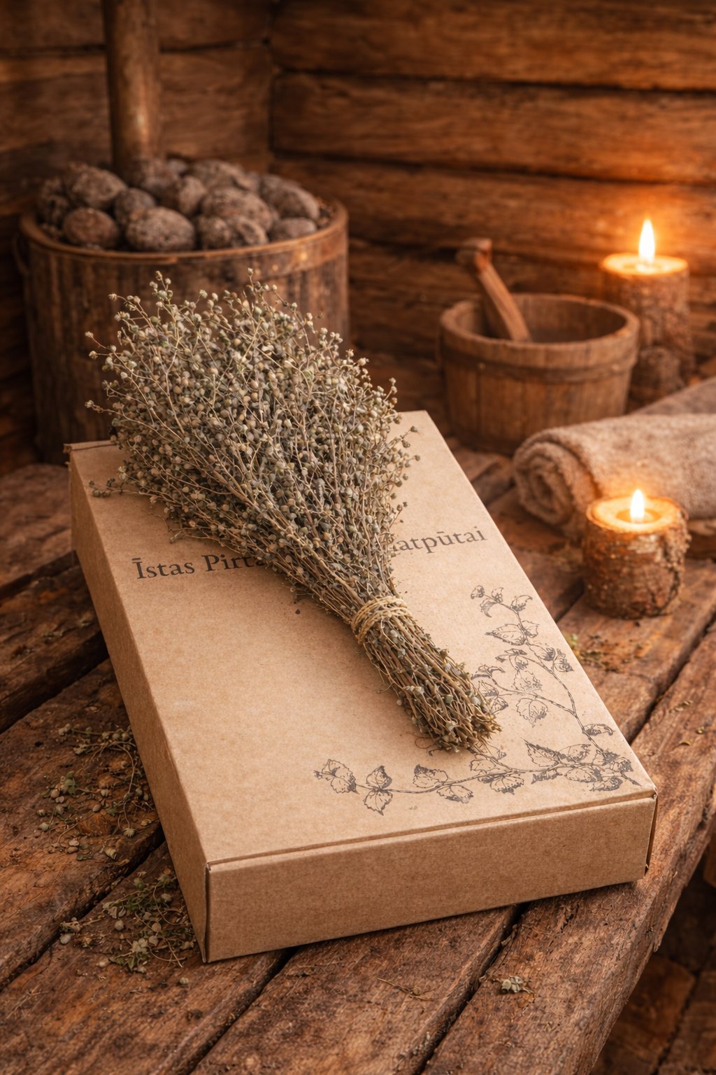 Pirts slotiņa uz dāvanu kastes pirts rituāla atmosfērā