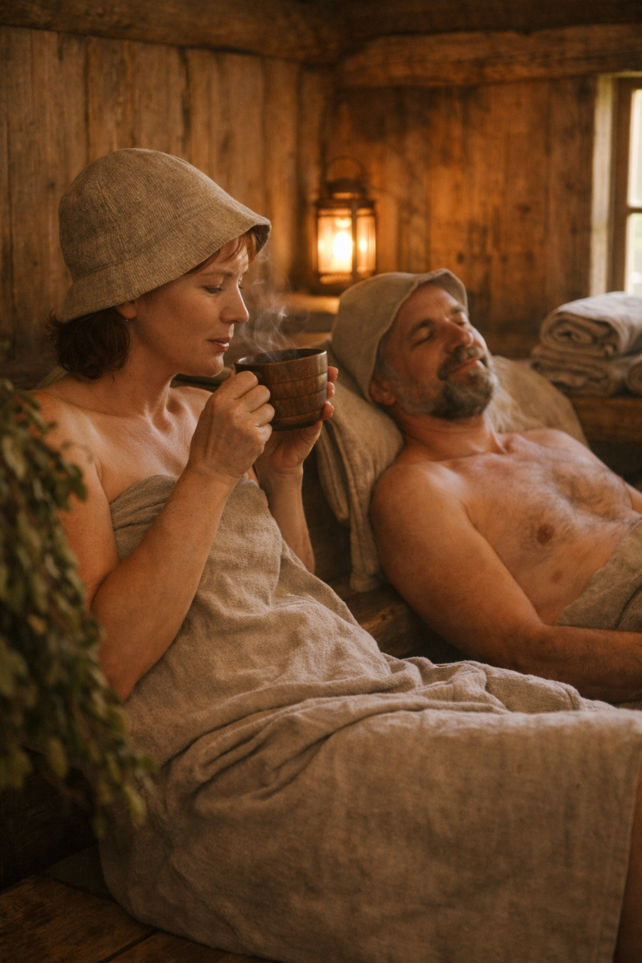 Priekštelpā Ieva iemalko tēju. Ne pirtī — tur tas nebūtu pareizi. Karstumā ķermenis strādā, bet šķidrums ir vajadzīgs atpūtā. Tēja palīdz siltumam palikt iekšā, nevis aizskriet prom.