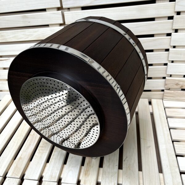 Тёмное дерево, металлические обручи и плавные формы создают ощущение прочности и уюта. Чаша выглядит естественно в интерьере любой бани и подчёркивает красоту натуральных материалов. Это предмет, который радует глаз и делает банное пространство гармоничным.